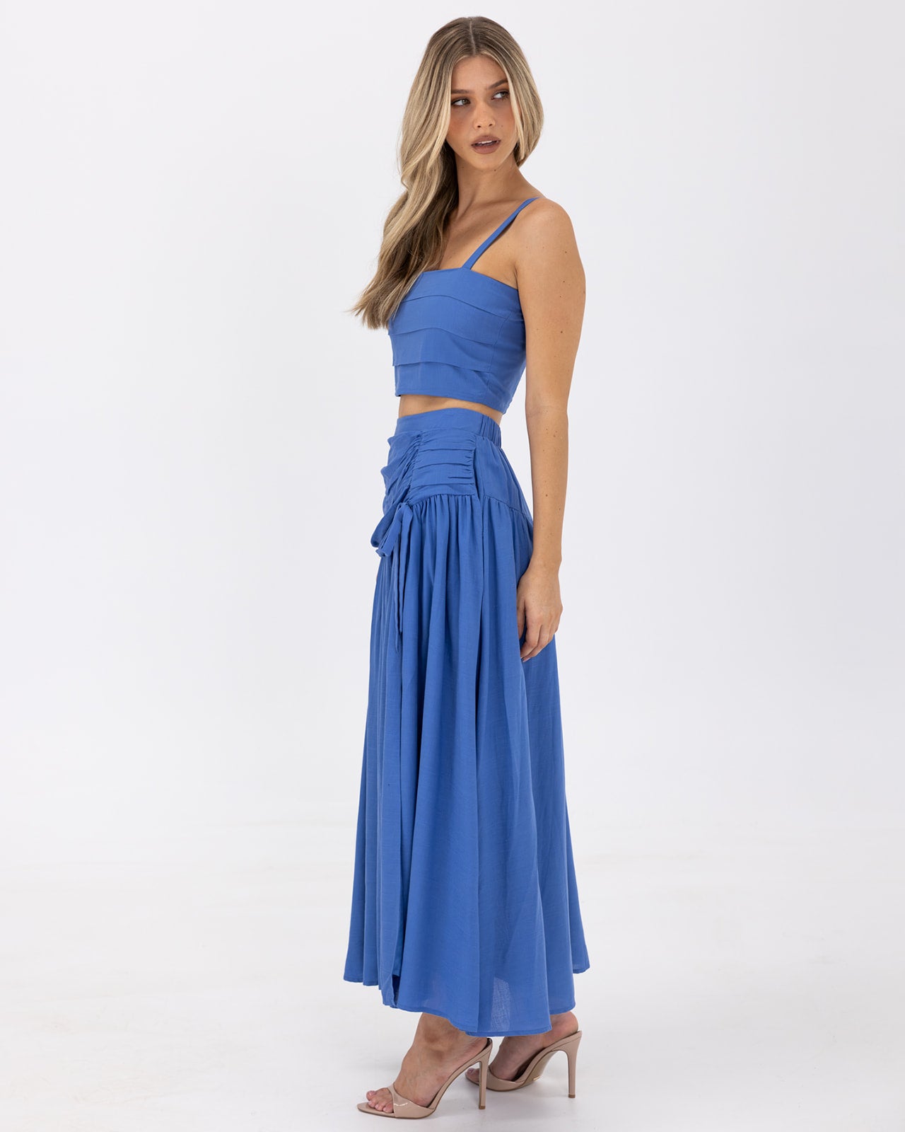 BIRDS OF PARADISE: Say "hello" to the beautiful Ralene Set by Twosisters the Label in cornflower blue. This set features a square-neck top with tiered design and a shirred back, and a maxi skirt with gathered details.