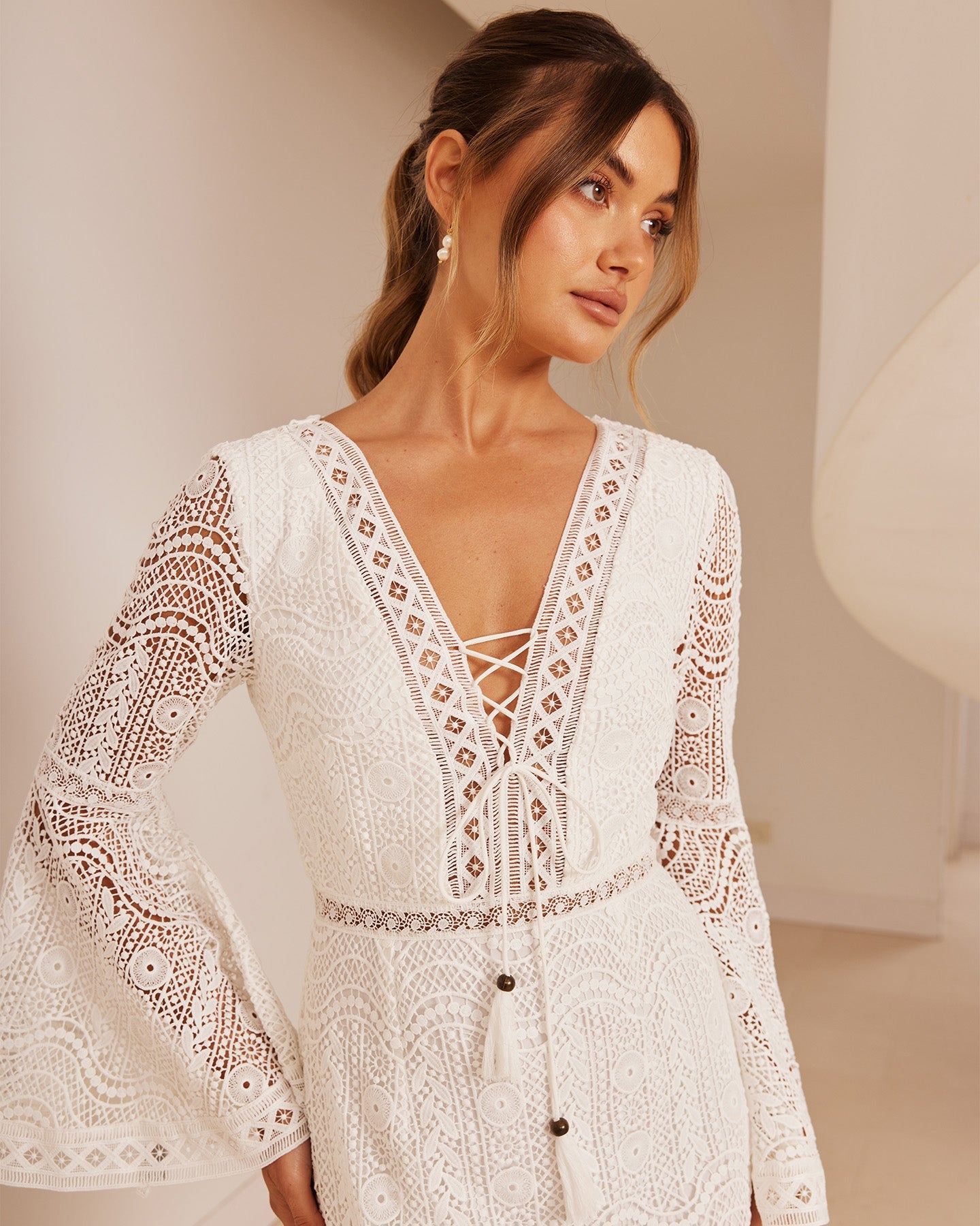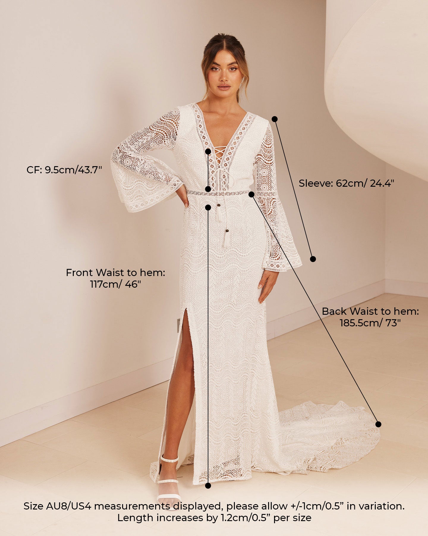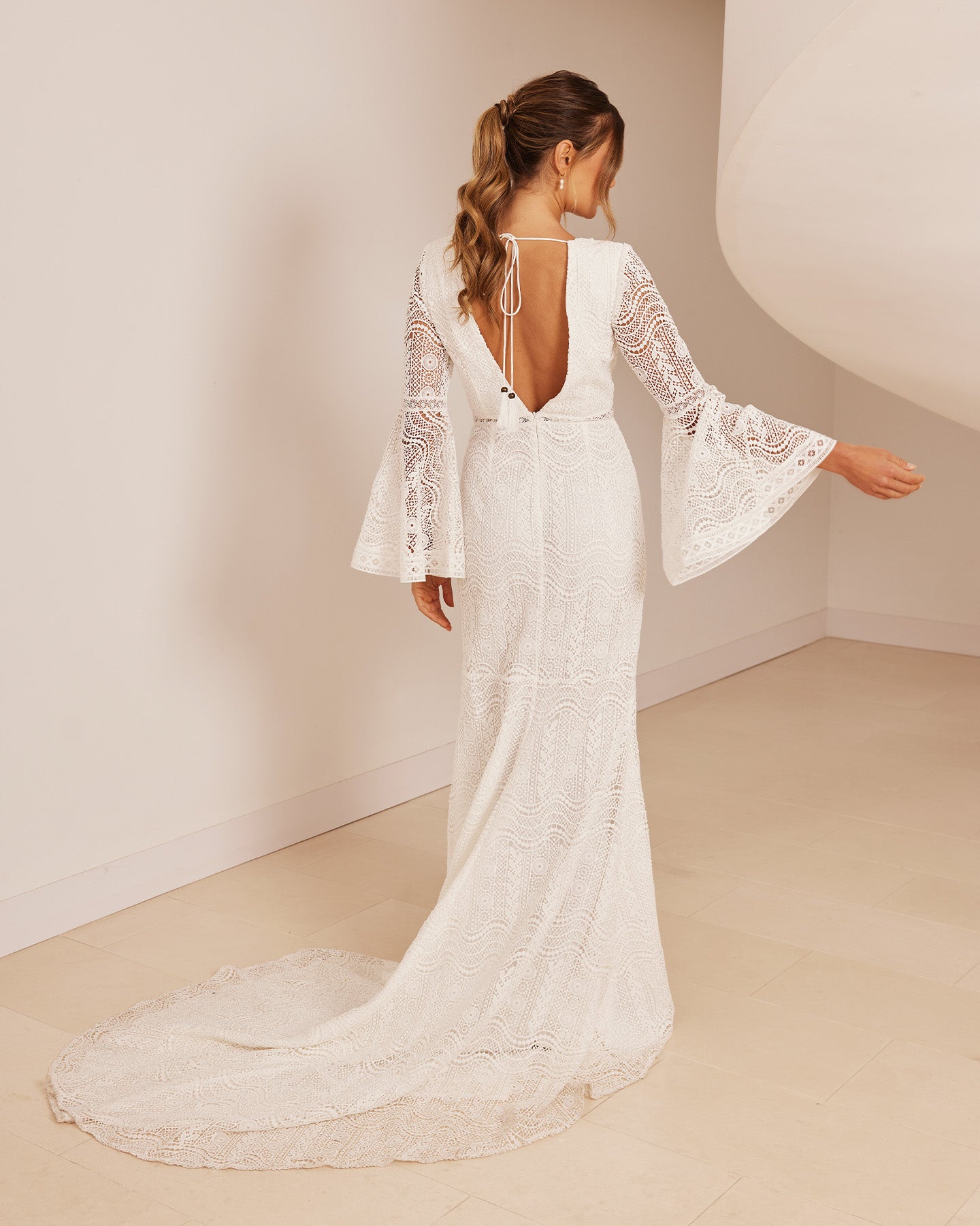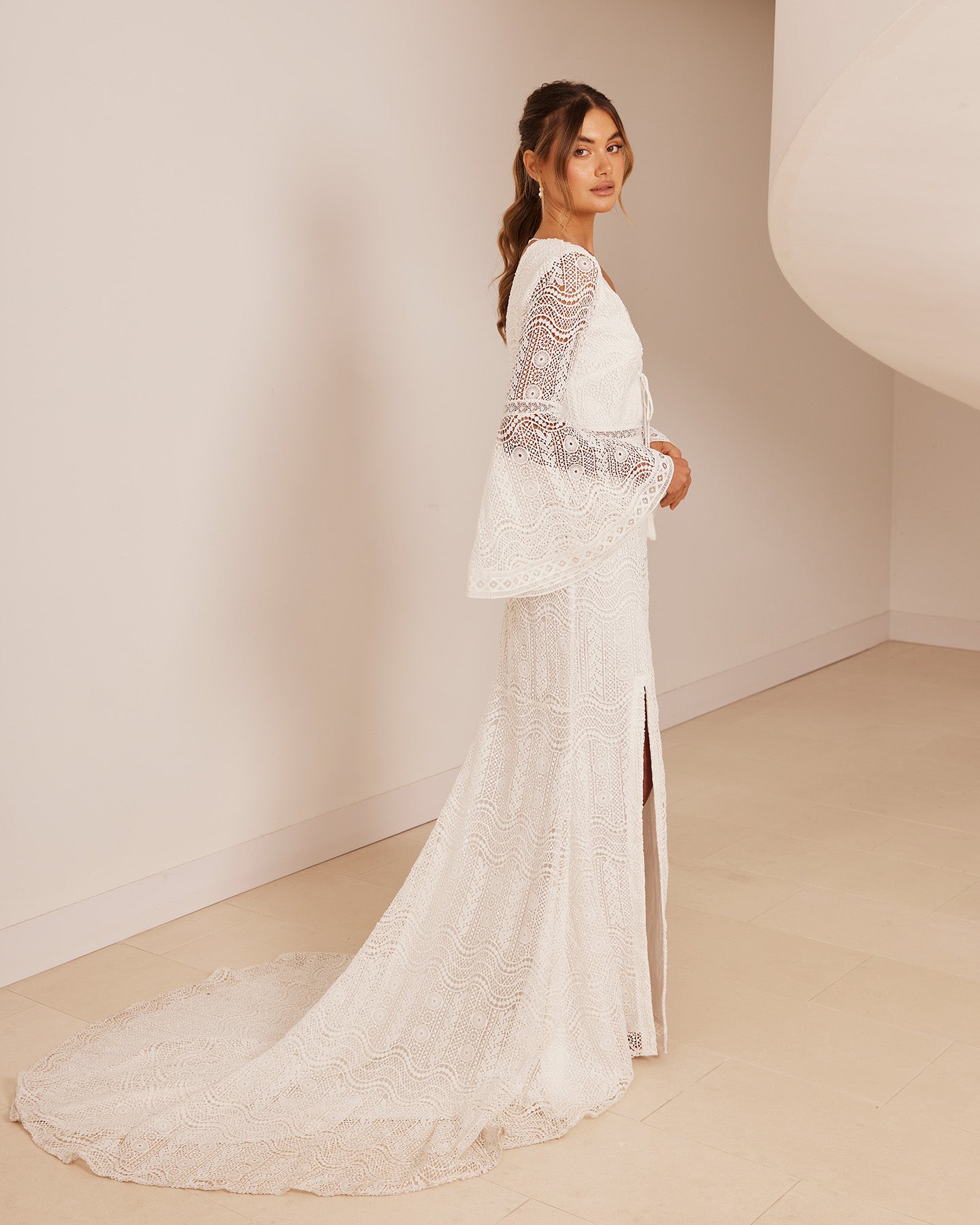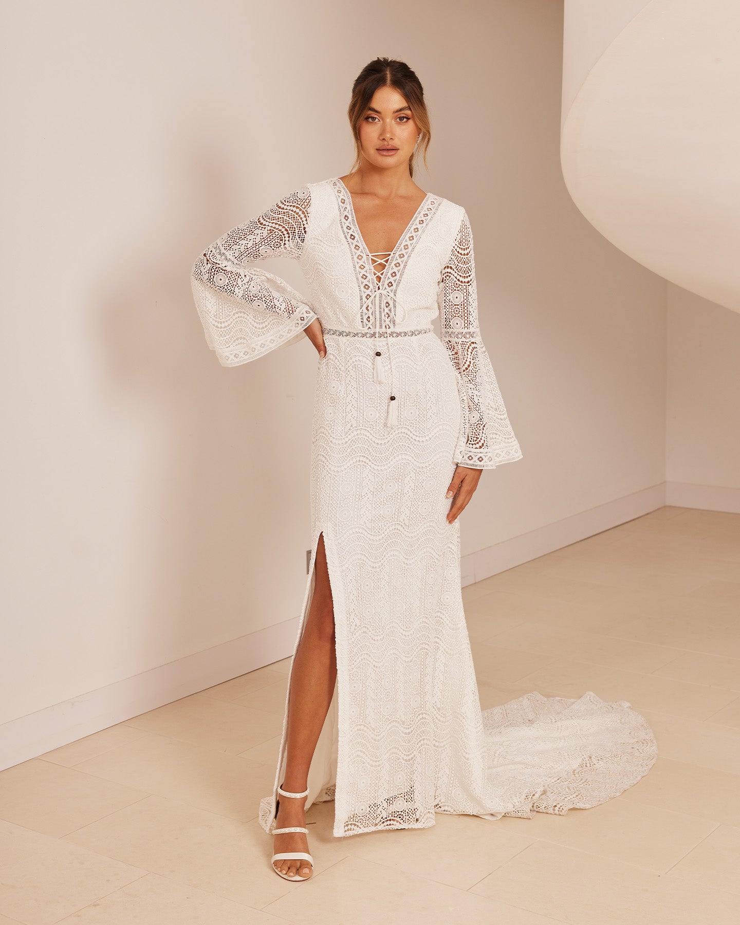 For the bohemian beauty, Twosisters The Label Eden Bridal Gown is worthy of a rustic countryside wedding with a breath of Mother Nature. Sheer trumpet sleeves and plunging neckline with lace-up details, this bridal gown is fit for an angel!