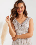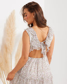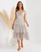Playful and flowy, the Twosisters The Label Laurel Dress is the perfect dress to give you that spring feeling all year round. Featuring a flattering v-neck bodice with frill detail, tie-up closure at back, elasticised waist and soft tiered skirt. Best worn with a simple heel or layered under your favourite knit with a pair of flats.