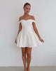 Make a statement in this elegant off-shoulder mini dress, designed with a playful yet sophisticated silhouette. Crafted in a smooth polyester-spandex blend, it offers a structured fit with subtle stretch for comfort. The standout feature is the hand stitched cascading pearl chain detail across the open back, giving it a luxe and glamorous edge. A flared skirt with a hidden layer of mesh tulle adds volume and movement, while the elastic armbands and side zipper ensure a secure, flattering fit.