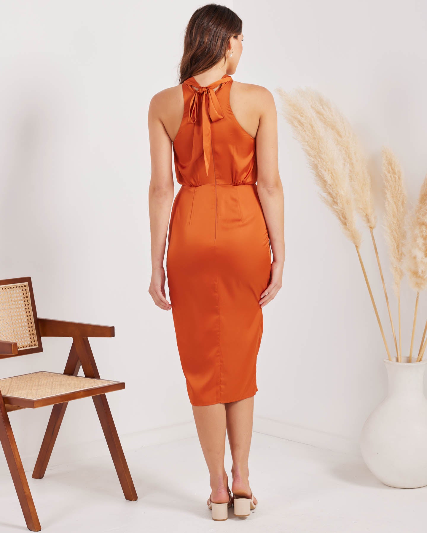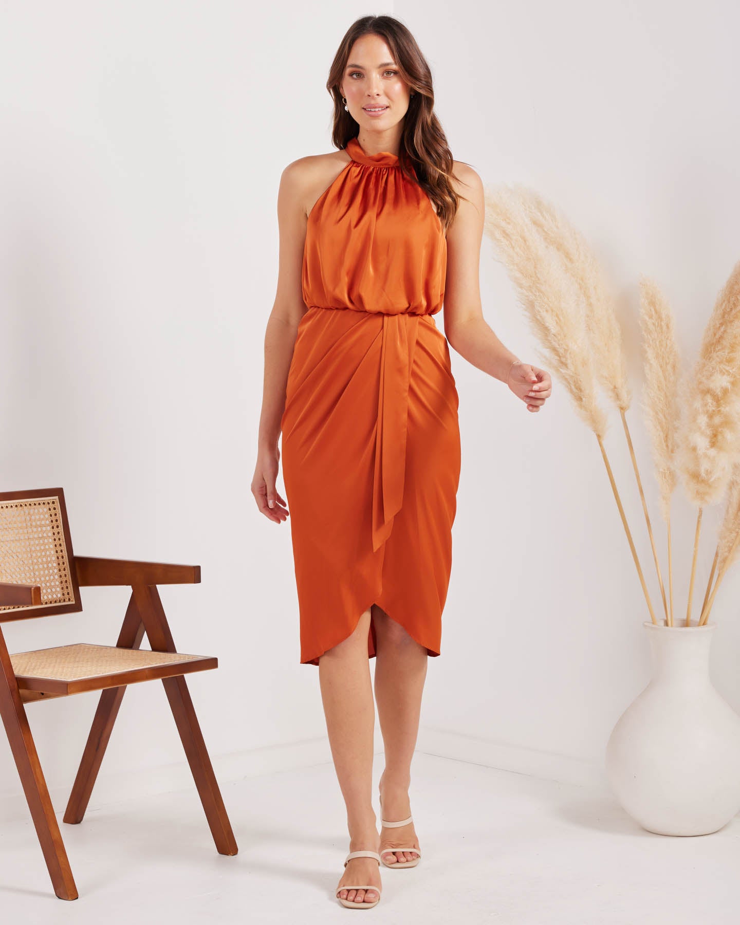 Twosisters The Label has brought another classic design into your collection! Halter neck, drape skirt, silky satin fabrication - this midi dress is faultless to the core. With sophisticated structures, wear Karina Dress to any semi-formal event of your dreams and trust that you'll be best-dressed.
