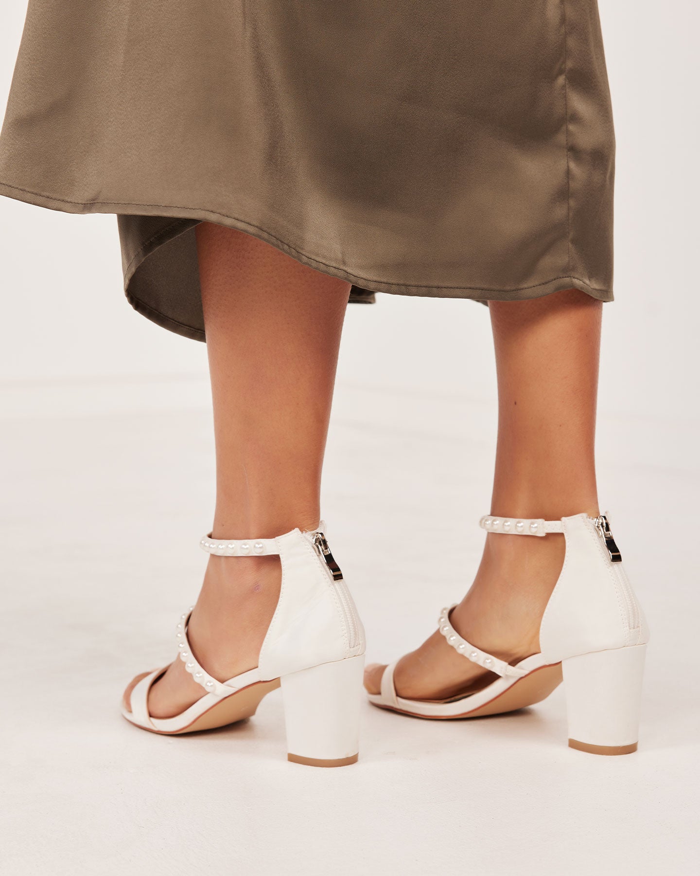 Satin-covered beauty. These precious babies feature pearly straps that wrap around your feet and ankles. Twosisters The Label Pandora Heels have comfort and elegance at the core of their design, making them a pair worthy of your big day!