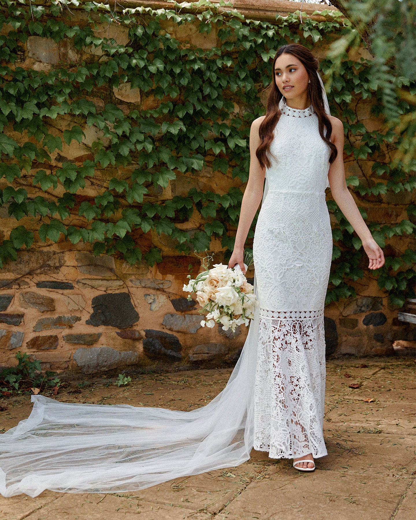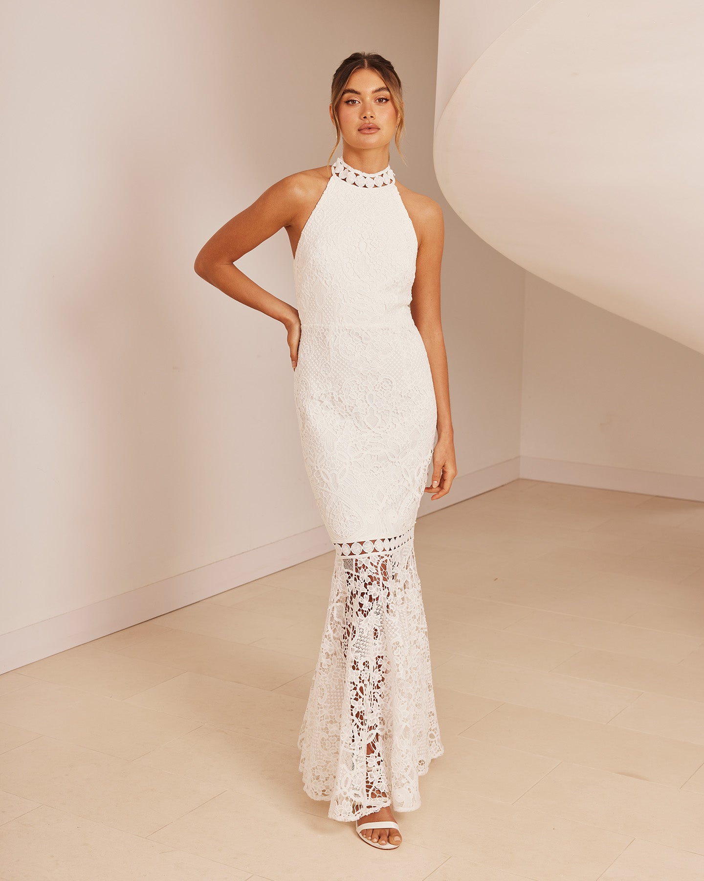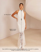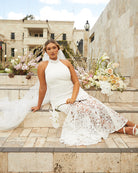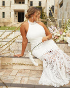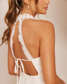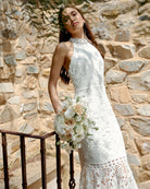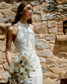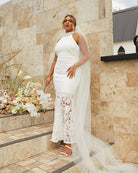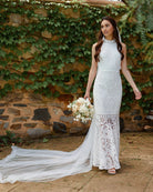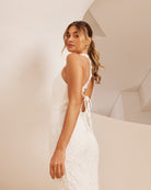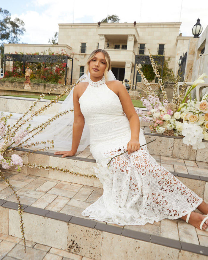 For the adventurous bride, Twosisters The Label Tallulah Dress is a maxi dress with halter neck, fishtail hem and figure fitting silhouette. Perfect for a passionate elopement with the dashing beau!