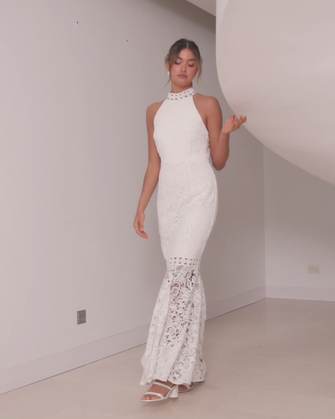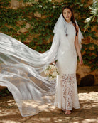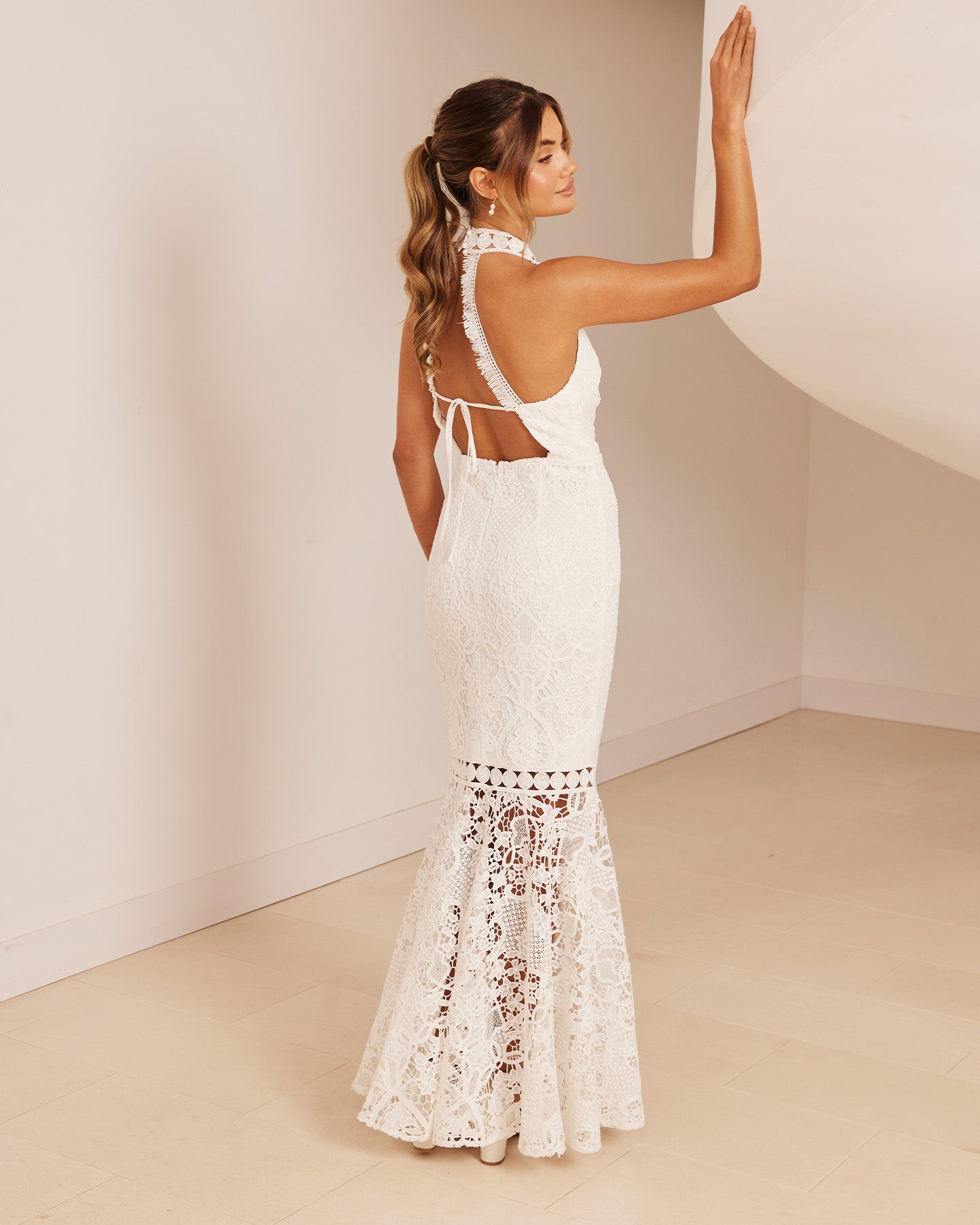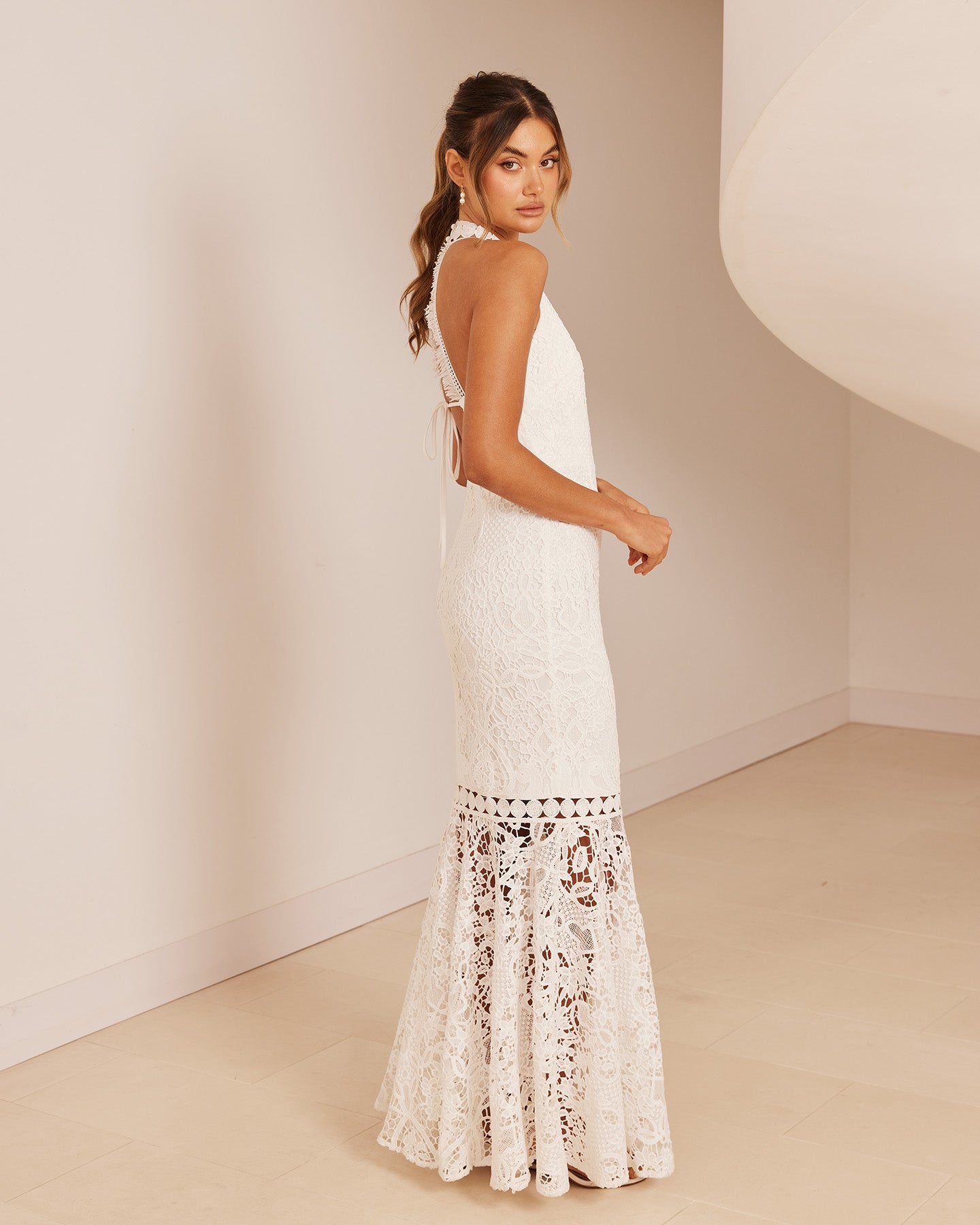 For the adventurous bride, Twosisters The Label Tallulah Dress is a maxi dress with halter neck, fishtail hem and figure fitting silhouette. Perfect for a passionate elopement with the dashing beau!