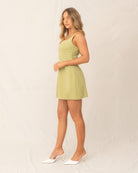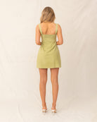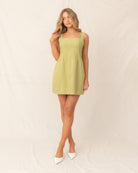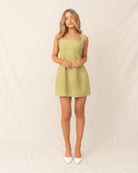 Casee Brim x Twosisters: Introducing the Ashleigh Mini Dress in Spring Green. This mini dress marries timeless sophistication and a touch of modern interest. This staple piece features corset stitching, a square neck and flared hem, creating a stunning silhouette. A demure addition to your collection, indeed!