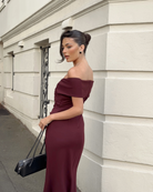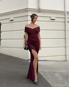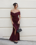 With a timeless off-shoulder neckline, a figure-flattering silhouette and mermaid-tail hem, be ready to embrace a commanding aura in every room you step into. This maxi dress is designed for black-tie events.
