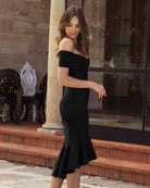 All eyes on you in the Twosisters The Label Brienne Dress. Featuring a flattering off the shoulder neckline with wrap detail, cinched waist and a fishtail style hem. This best selling midi dress is the perfect wardrobe addition for classic event wear glam.
