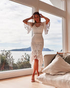 Elegant and timeless, the Twosisters The Label Reyna Dress is a best selling white midi style. Features short sheer sleeves, a fitted silhouette and subtle tiered high low hem. Perfect for the soon to be bride, celebrate your special day in this stunning lace style.