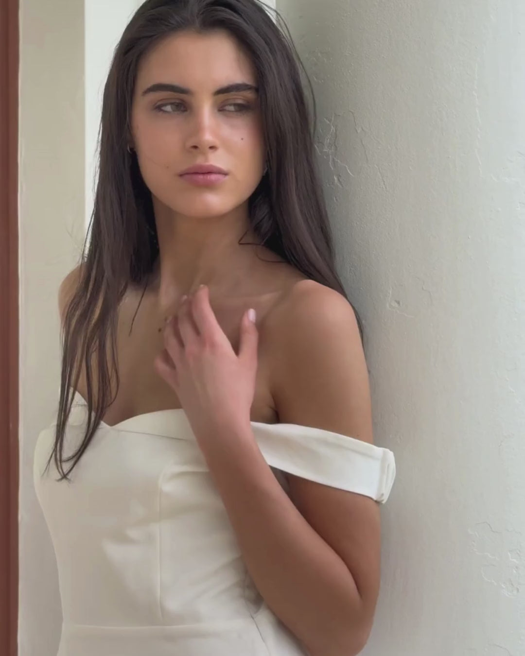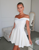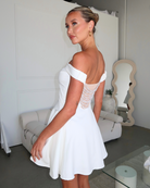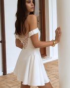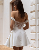Make a statement in this elegant off-shoulder mini dress, designed with a playful yet sophisticated silhouette. Crafted in a smooth polyester-spandex blend, it offers a structured fit with subtle stretch for comfort. The standout feature is the hand stitched cascading pearl chain detail across the open back, giving it a luxe and glamorous edge. A flared skirt with a hidden layer of mesh tulle adds volume and movement, while the elastic armbands and side zipper ensure a secure, flattering fit.