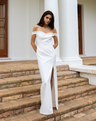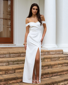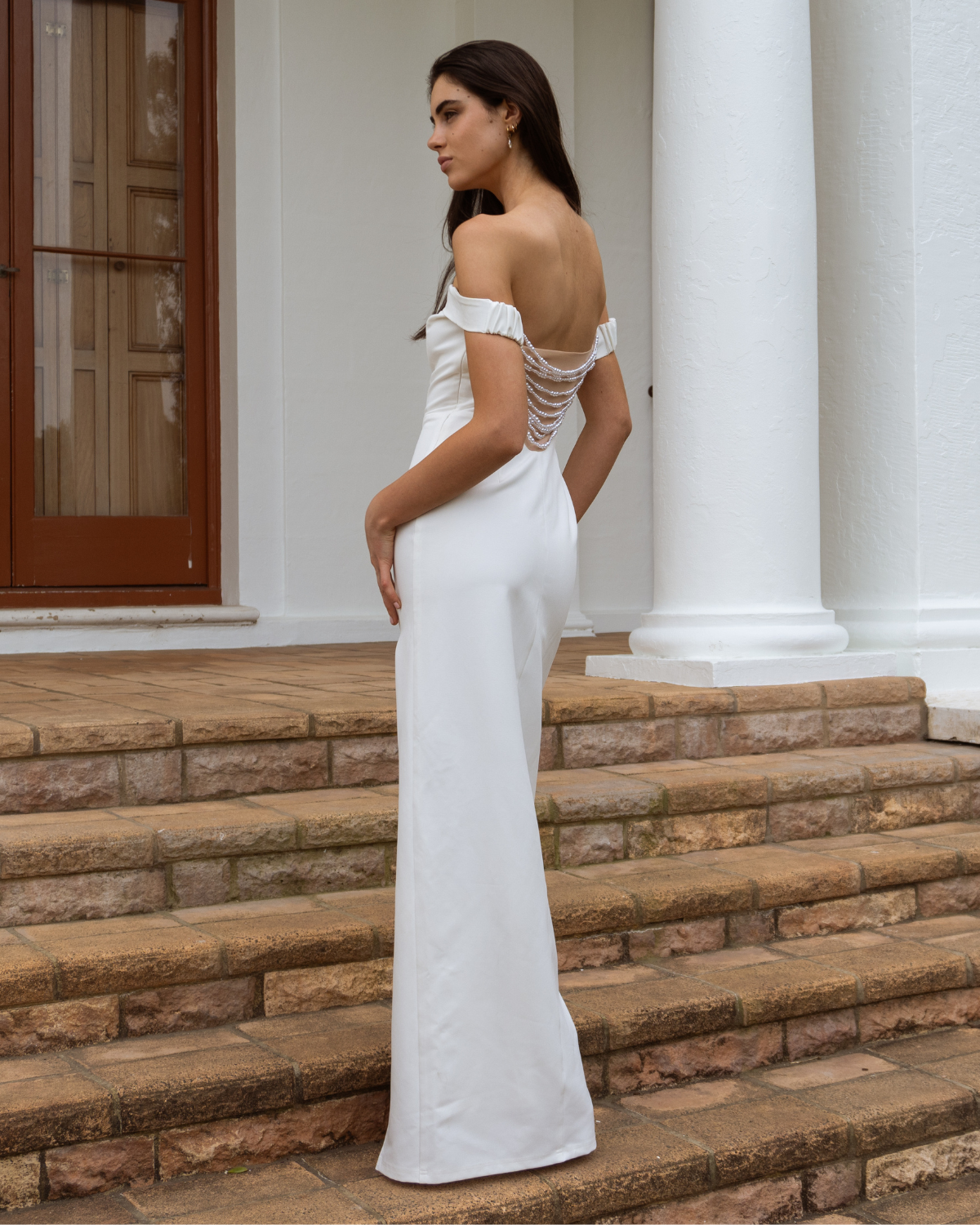 Effortlessly elegant, this off-shoulder dress is designed to make an entrance. Crafted from a smooth polyester-spandex blend, it features a structured silhouette with a floor-length wide leg for timeless sophistication. The off-shoulder neckline is finished with elastic armbands for comfort, while the back is detailed with delicate pearl chain draping — adding a touch of glamour to its sleek design.