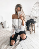 A best selling lace style, the Twosisters The Label Gypsy Top is a versatile investment for your wardrobe. Featuring a fitted off the shoulder cropped bodice with sheer lace overlay and flared sheer sleeve. Dress it up with a leather mini or pair it back with your favourite high-waisted denim.