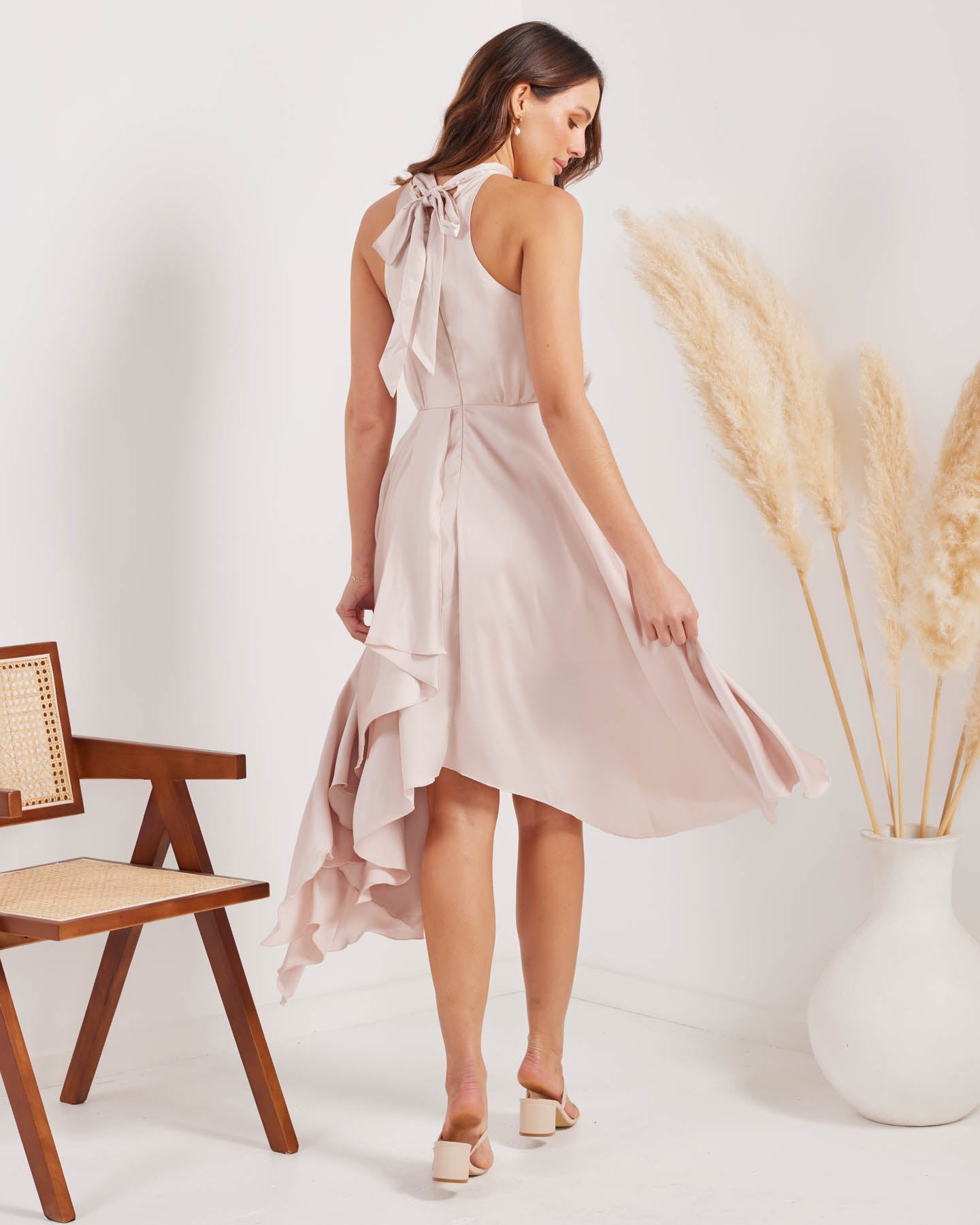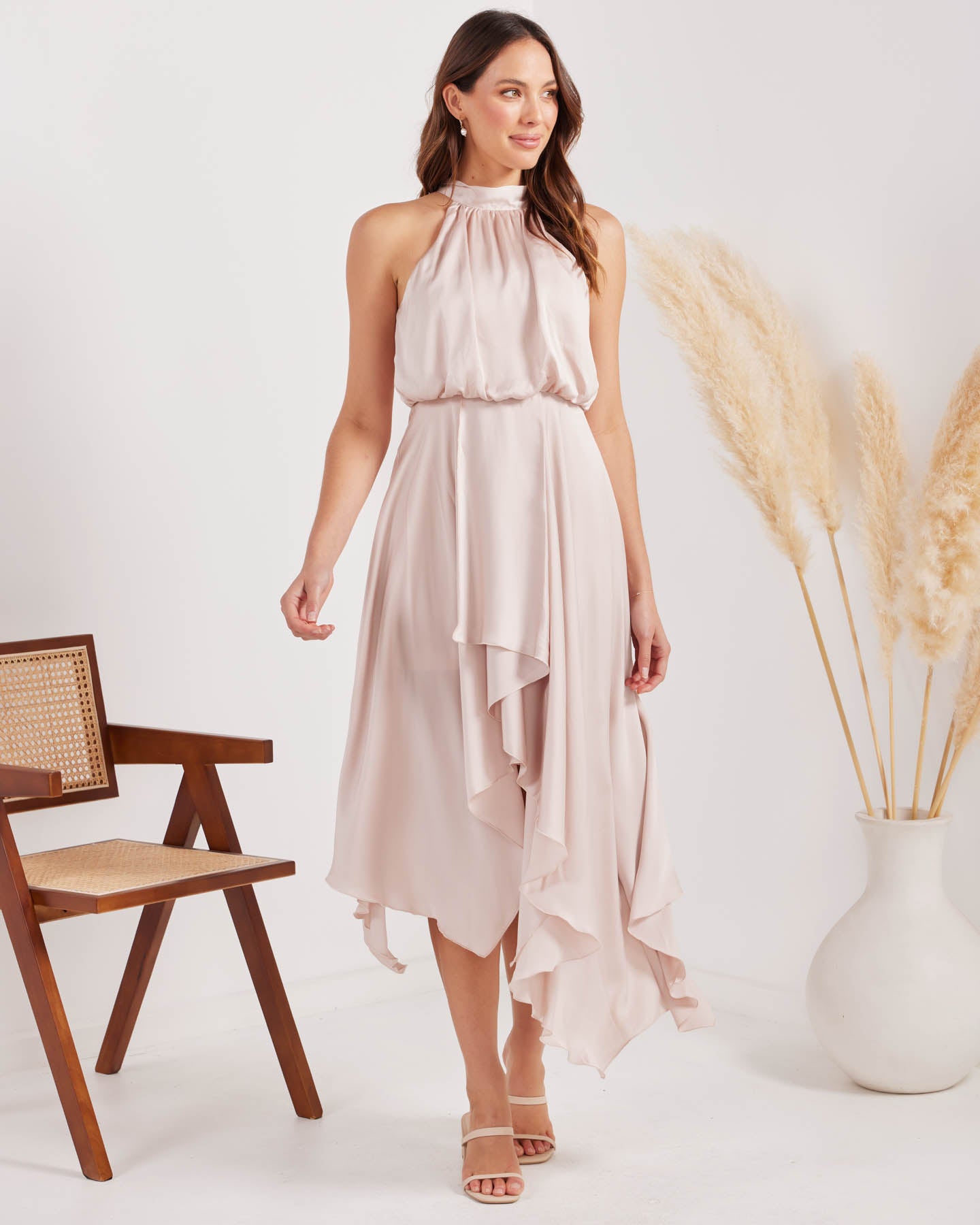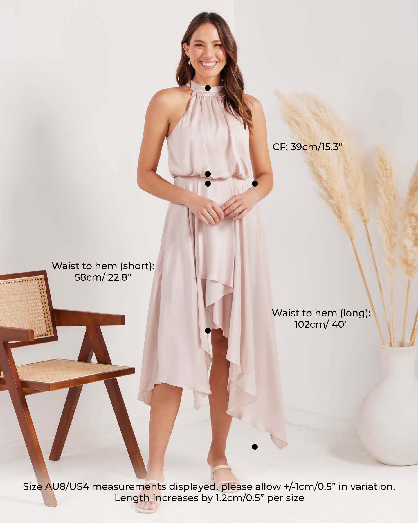 Effortlessly glam, the Twosisters The Label Kat Dress is an update on our best selling Kathleen Dress. Features a flattering tie up halter neckline, cinched in waist and flowing high-low hem. This champagne formal dress is finished with a midweight satin, perfect for your bridesmaids on your special day.