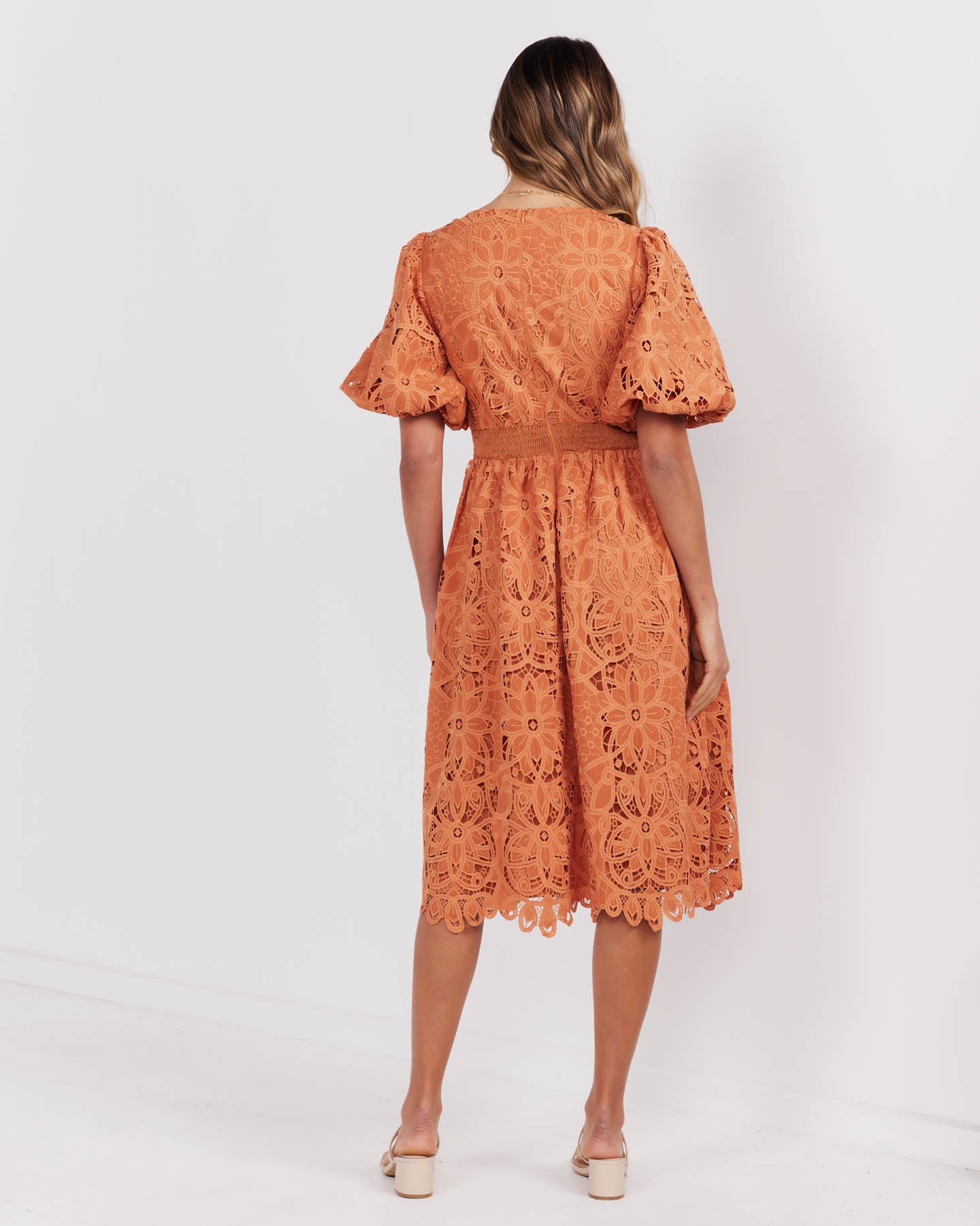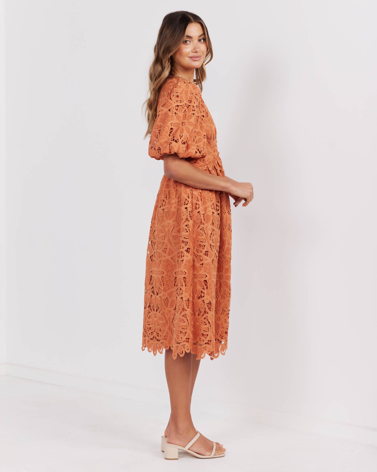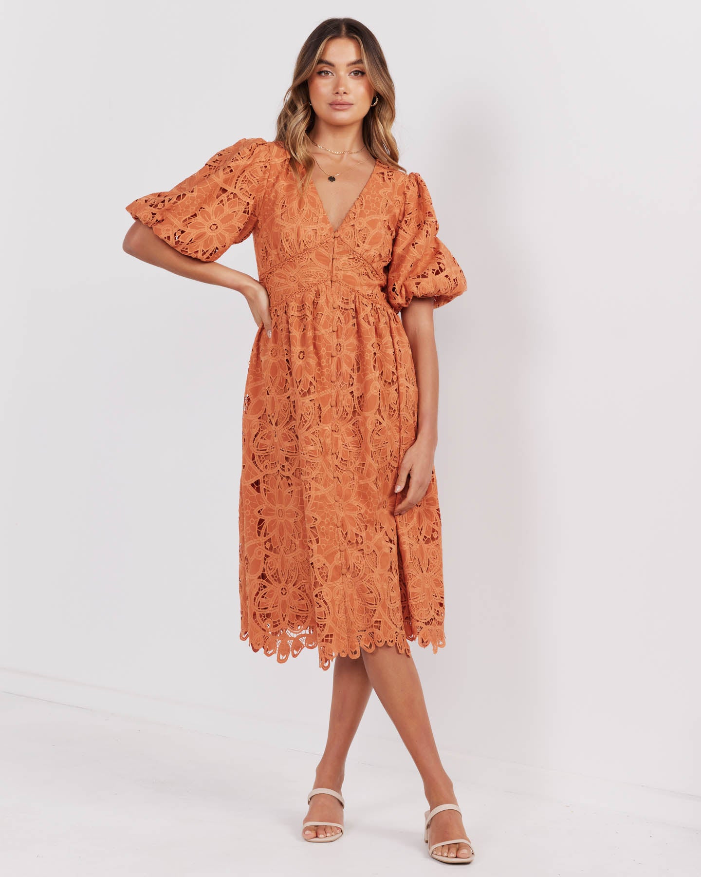 If style and functionality were a dress. The Londyn Dress by Twosisters The Label is a midi dress with a contemporary silhouette, puff sleeves and side pockets. Although modest, this midi dress is full of character. This signature lace design is a comfy and confident choice for "meeting the parents" (yikes!)